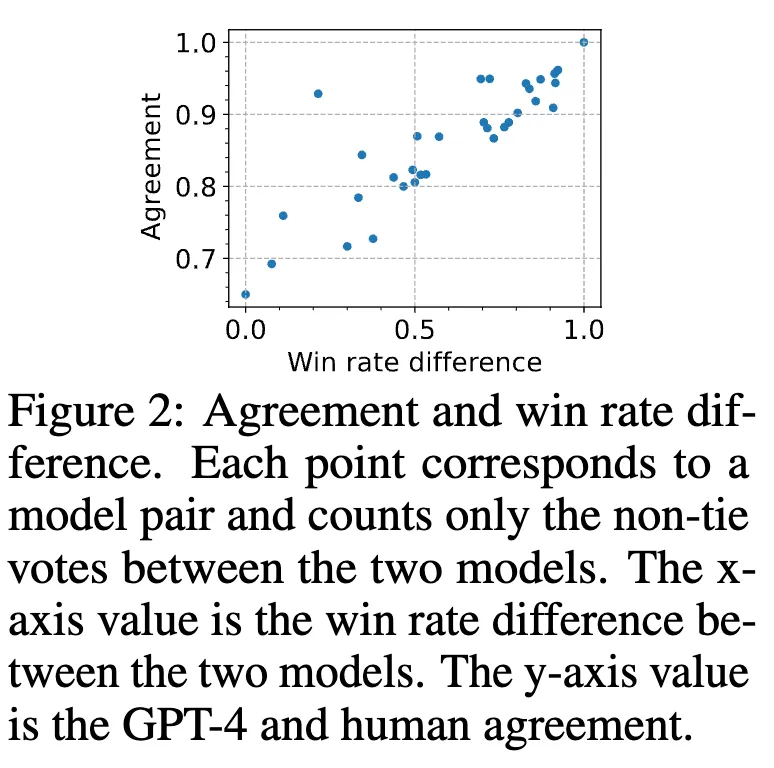 동점이 아닌 투표만 포함했을 때, 모델 쌍 간의 성능 차이(즉, 더 큰 승률 차이)에 따라 GPT-4와 인간 간의 Agreement가 점진적으로 증가하여 70%에서 거의 100%에 이르는 것을 보여주는 그림이다. (그런데 이 말은 모델 간의 성능 차이가 크면 그만큼 평가하기 쉽기 때문에 인간과 더 잘 일치함을 의미하는 당연한 결과이지 않나 싶다..)