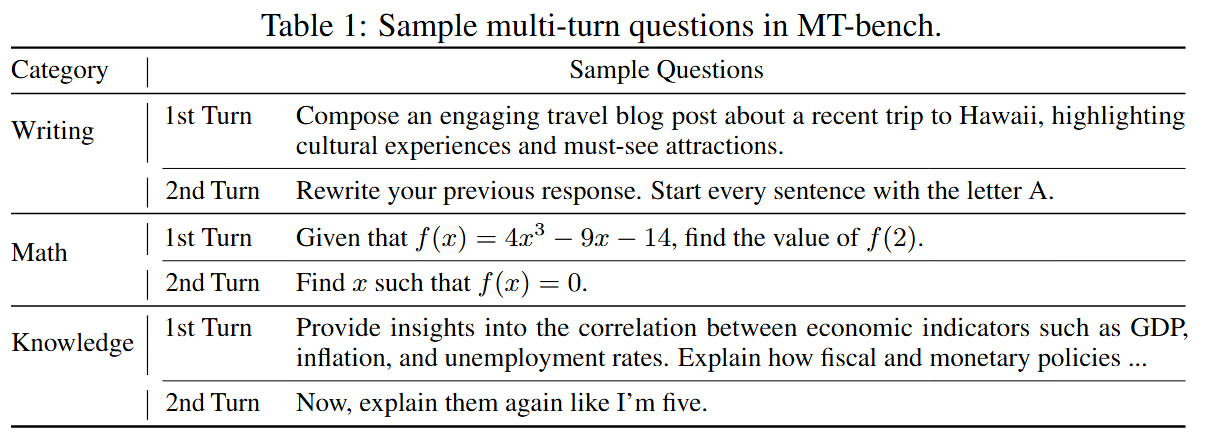 80개의 고품질 다중 턴 질문으로 구성되었으며 다중 턴 대화와 명령 수행 능력을 테스트하도록 설계되었다. 일반적인 사용 사례를 다루고, 모델을 차별화할 수 있는 도전적인 질문에 중점을 두었다. MT-bench를 구성하기 위해 8가지 일반적인 사용자 프롬프트 카테고리를 정하고, 각 카테고리에 대해 10개의 다중 턴 질문을 수작업으로 설계되었다.